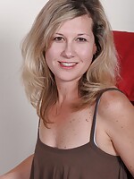 - Leggy blonde cougar penetrates her mature wet pussy with a v...